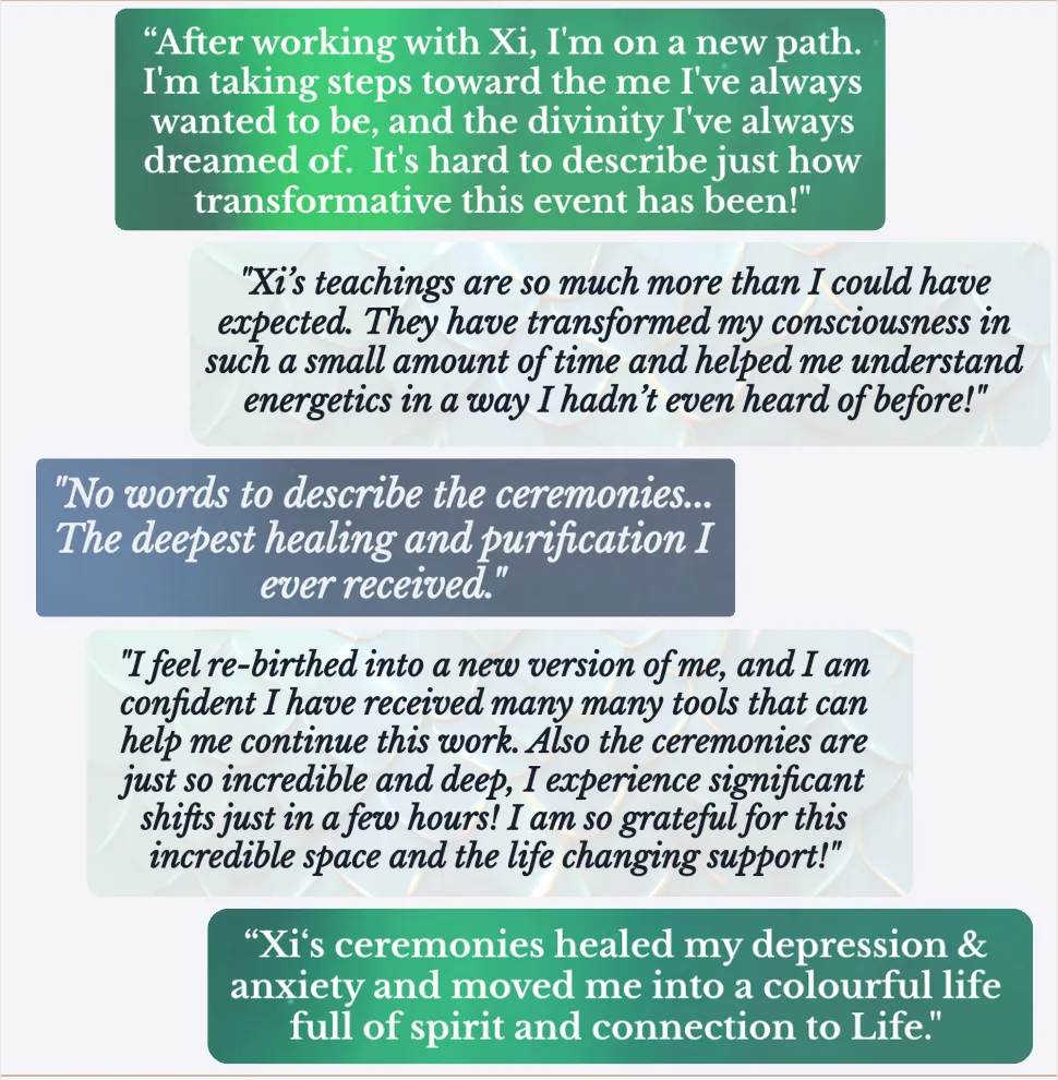 ❝After working with Xi, I'm on a new path. I'm taking steps toward the me I've always wanted to be, and the divinity I've always dreamed of. It's hard to describe just how transformative this event has been!❞
